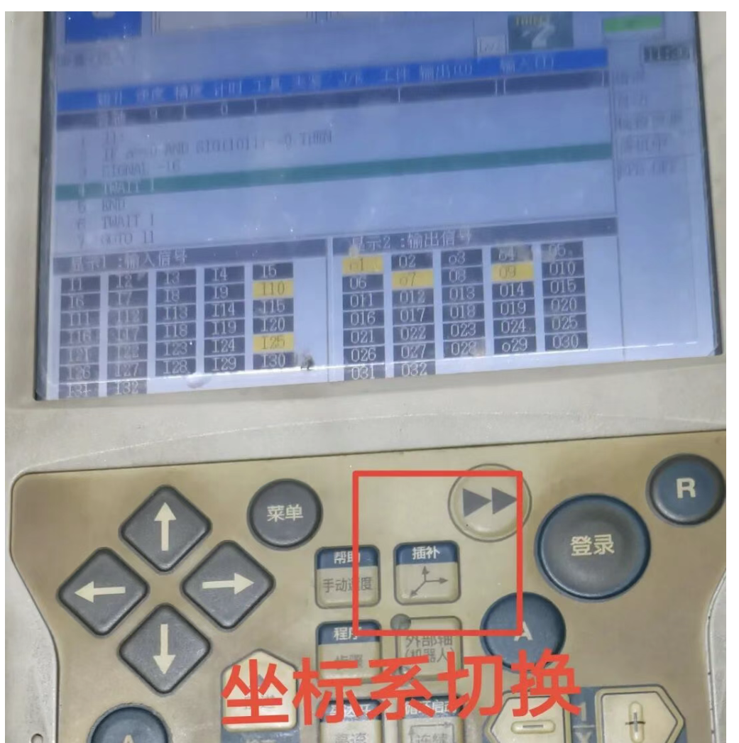 关节坐标(JOINT各轴单独移动)、基坐标(base直线移动)、工具坐标(TOOL工具坐标系移动)可循环切换。